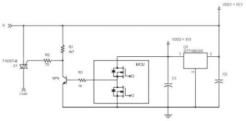 基于這些原因,圖2的電路示意圖整合了負電源和正穩(wěn)壓器的雙重優(yōu)點。在這個示意圖中,ST715M33R是最大靜態(tài)電流5.5 µA的正穩(wěn)壓器,與“負”15V輸出相連,為微控制器提供3.3V電源電壓,其中,-15V電壓是基于VIPer06的降壓升壓轉(zhuǎn)換器或反激式轉(zhuǎn)換器的輸出 (參見意法半導體的AN4564應用筆記)。T1635T-8是一個T系列三象限雙向可控硅,微控制器能夠吸收T1635T-8的電流。
