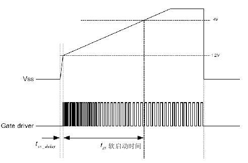 電源的軟啟動(dòng)對(duì)降低場(chǎng)效應(yīng)管和輸出二極管的尖峰電壓和尖峰電流有很大幫助,從而降低了其電壓應(yīng)力和電流應(yīng)力。但是對(duì)于LLC諧振電源來(lái)說(shuō),軟啟動(dòng)對(duì)電源起機(jī)的可靠性非常關(guān)鍵;因?yàn)長(zhǎng)LC電源的IC是通過高頻掃描的方式啟動(dòng)的。如圖6所示在IC啟動(dòng)時(shí)驅(qū)動(dòng)PWM頻率會(huì)從設(shè)定的最高頻率開始慢慢恢復(fù)正常頻率,恢復(fù)時(shí)間也就是軟啟動(dòng)時(shí)間。在此期間電源工作在不穩(wěn)定狀態(tài),軟啟動(dòng)時(shí)間越長(zhǎng),啟動(dòng)越安全;但軟啟動(dòng)時(shí)間過長(zhǎng)也會(huì)對(duì)電源帶容性負(fù)載能力和起機(jī)時(shí)間造成影響。