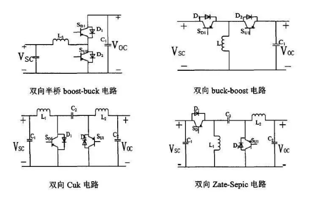 非隔離雙向DCDC,結(jié)構(gòu)比較簡(jiǎn)單,每個(gè)部件都是直接相連,沒有額外的能量損失,工作效率比較髙。對(duì)升壓側(cè)的電容要求比較高。主要的非隔離DCDC電路結(jié)構(gòu)有雙向半橋boost-buck電路,雙向buck-boost電路,雙向buck電路,雙向Zate-Sepic電路,如下圖所示。